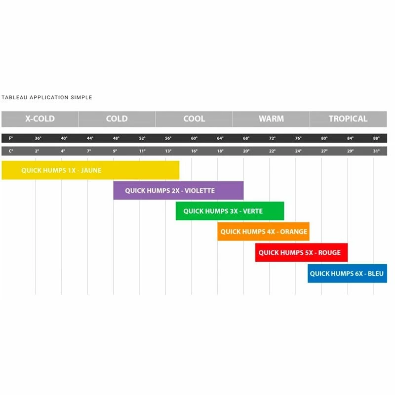 Chaque Quick Humps dispose d’un « X-NUMBER » qui indique la dureté relative et l’adhésivité des six formules différentes. La formule « 1X » est la formule Quick Humps la plus douce et la plus collante et la formule « 6X » est la formule la plus dure et la moins collante. Lorsque les températures recommandées pour deux formules Quick Humps ou plus se chevauchent, utilisez les « X-NUMBERS » pour déterminer votre préférence.